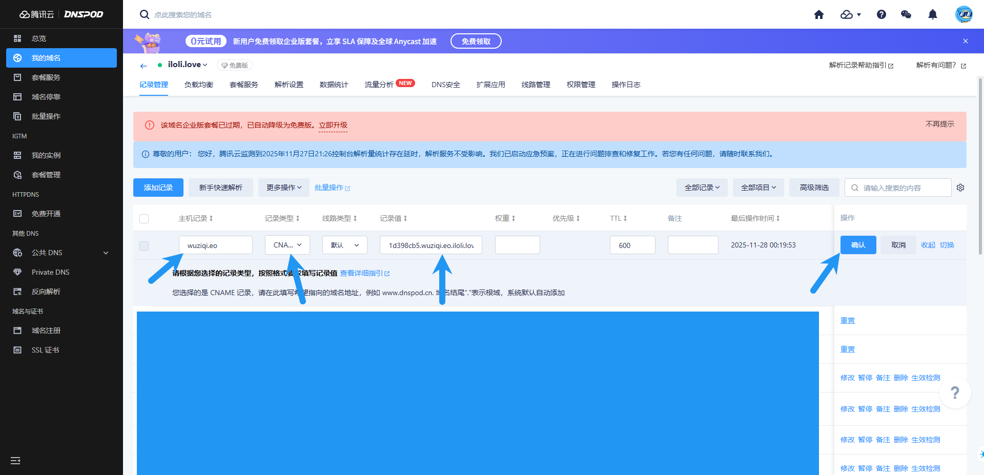 添加到自己的域名解析,以我自己的为例,粘贴 主机记录 和 记录值 ,记录类型选择 CNAME ,点击 确认