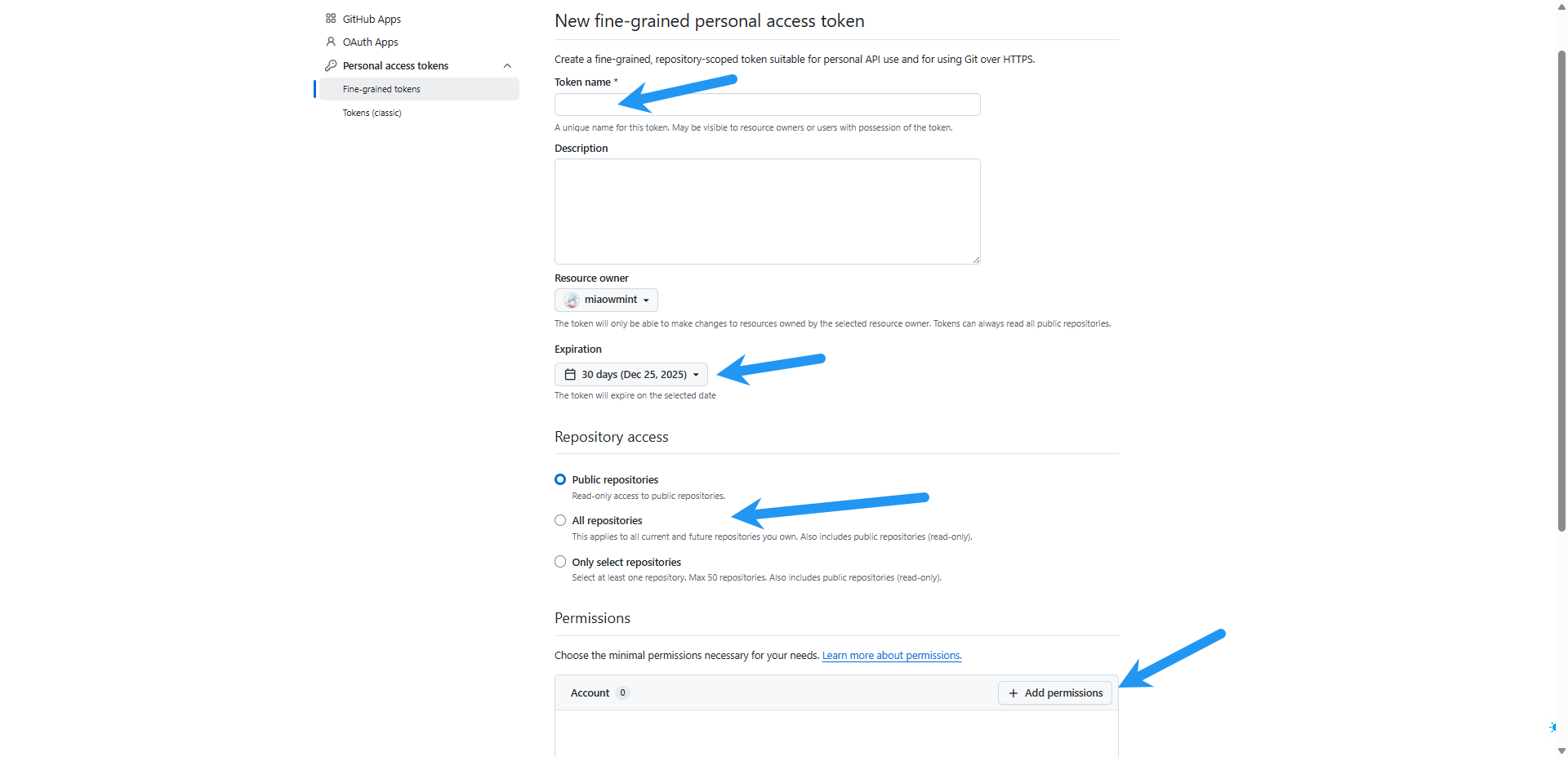 刚刚获取的密钥是全权限的,如果有权限方面的顾虑,可以访问 https://github.com/settings/personal-access-tokens/new (和刚才的链接是不一样的)根据自己的实际情况,精细化调整令牌的权限范围,这里就不过多赘述了(因为这个太精细化,太麻烦了)