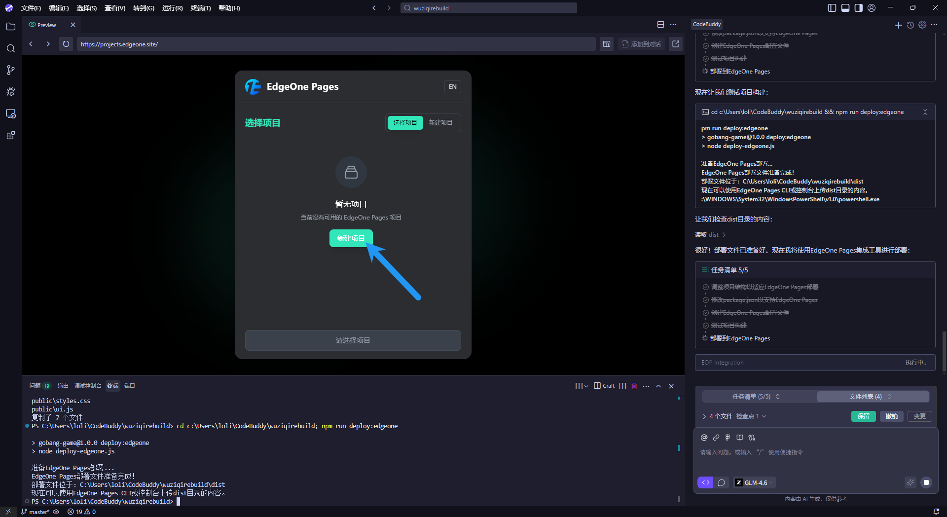 EdgeOnePages集成 会自动打开配置网页,因为是新项目,所以这里我们选择 新建项目