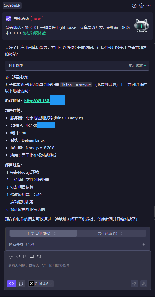 等待一段时间后,部署完成,AI会自动打开预览链接,并总结部署过程,实际测试确实是能够游玩的