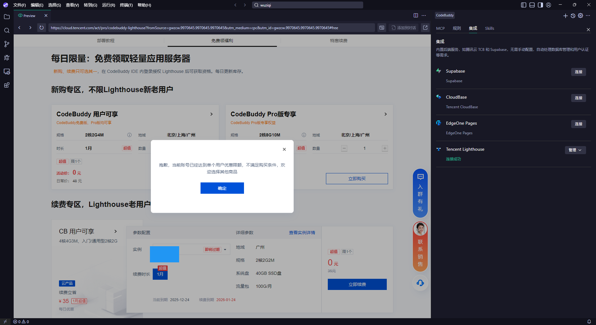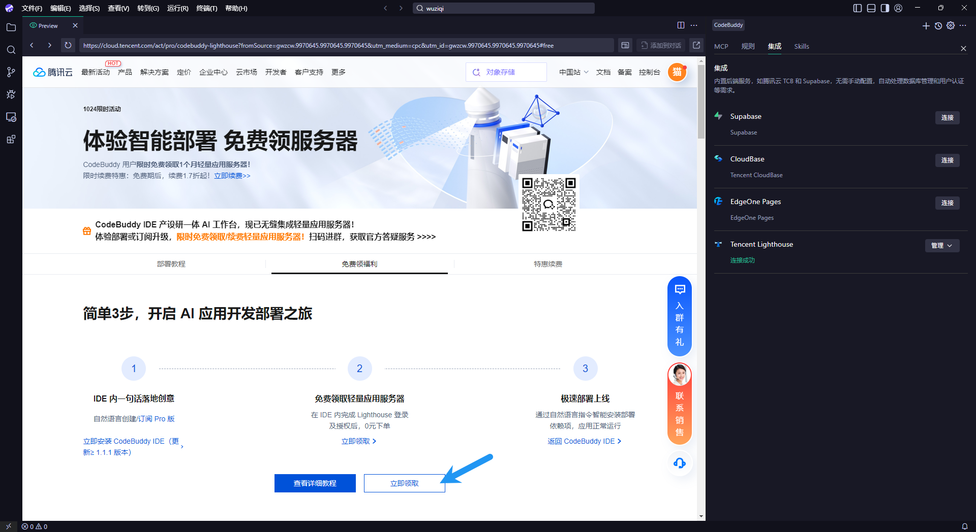 完成 4.1 连接到腾讯云Lighthouse 后,会自动跳转到活动页 https://cloud.tencent.com/act/pro/codebuddy-lighthouse ,点击 立即领取
