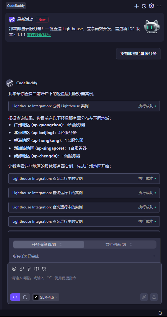 询问AI,我有哪些轻量服务器 ,可以看到,我的所有轻量服务器被列出;复制我们测试机的ID,接下来要用到