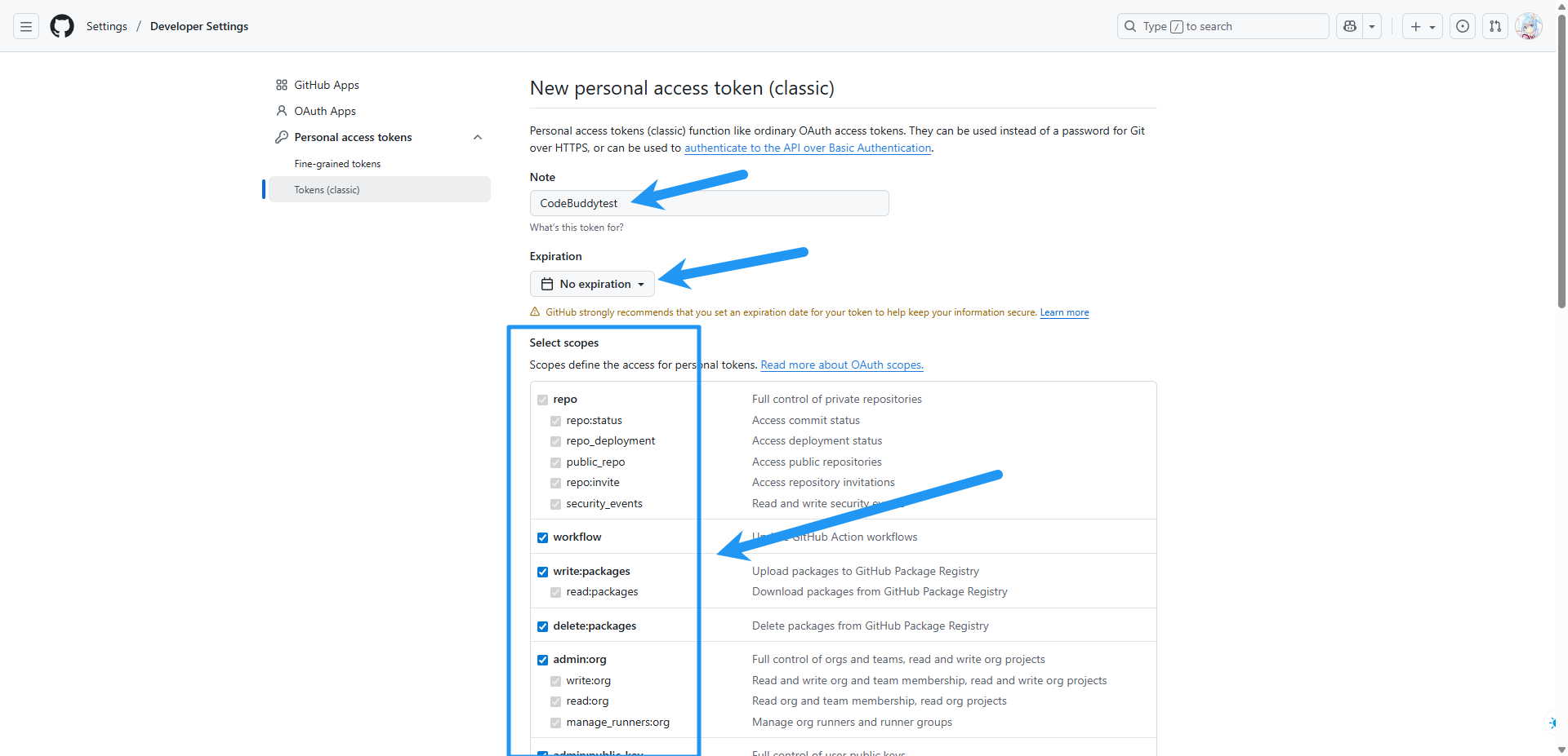 填写令牌名(随意),过期时间调整为不过期,下方的权限全部勾选上,点击最下面的生成令牌