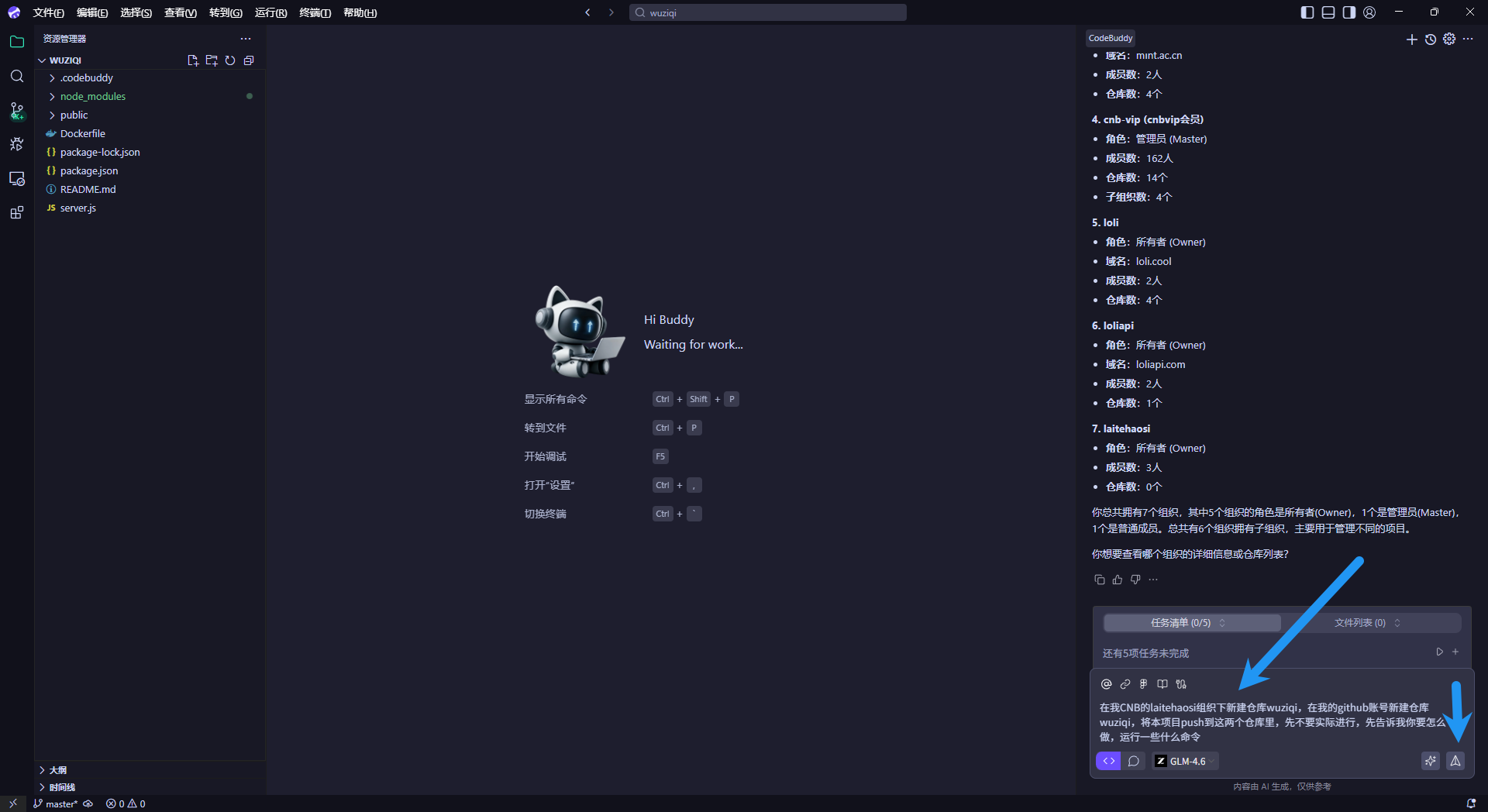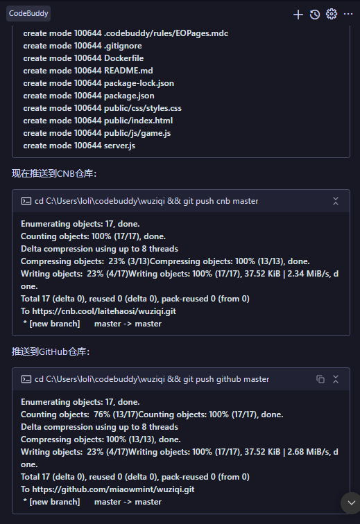 到这里我们就成功的通过 CodeBuddy 把项目 Push 到 CNB 和 GitHub 这俩代码托管平台了