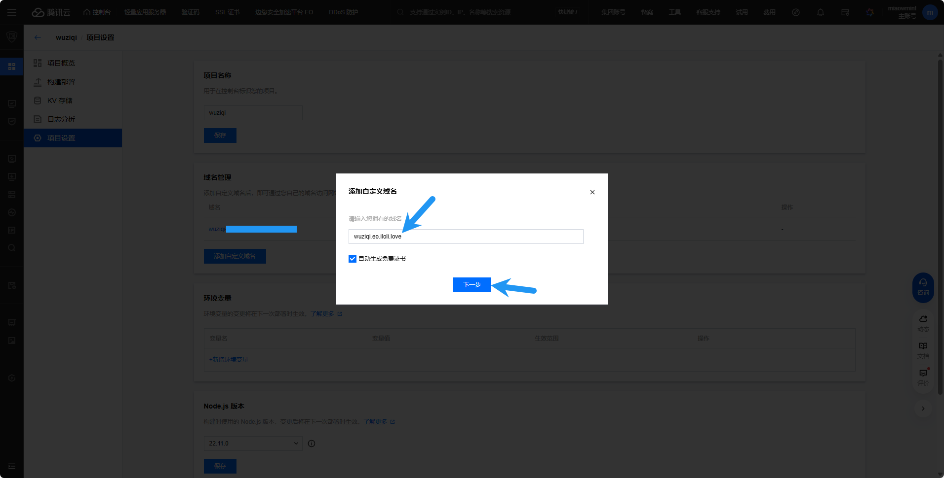 输入 要绑定的域名(我这里添加的是我自己的域名 wuziqi.eo.iloli.love ),勾选 自动生成免费证书 ,点击 下一步