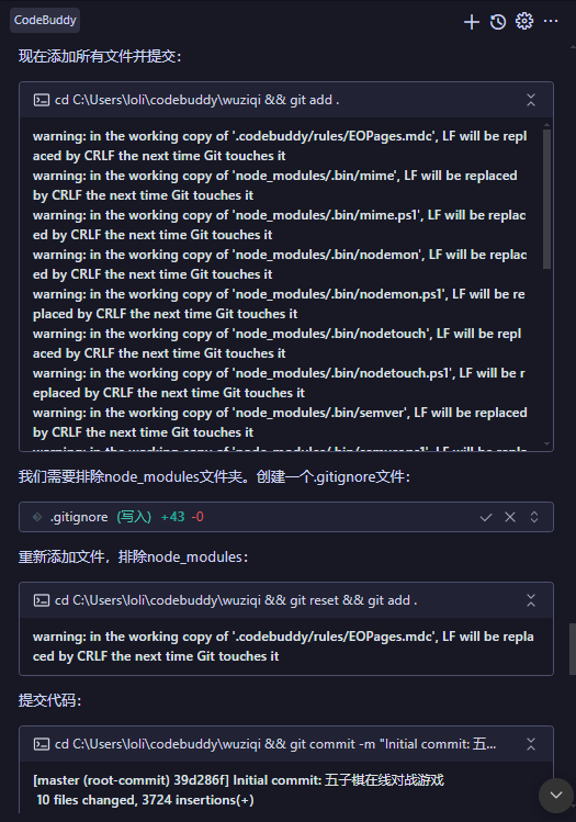 稳妥起见,我们先审计一下AI的接下来的操作有没有什么问题,向AI发送指令 在我CNB的laitehaosi组织下新建仓库wuziqi,在我的github账号新建仓库wuziqi,将本项目push到这两个仓库里,先不要实际进行,先告诉我你要怎么做,运行一些什么命令 (仅为示例,请修改为你的具体信息)
