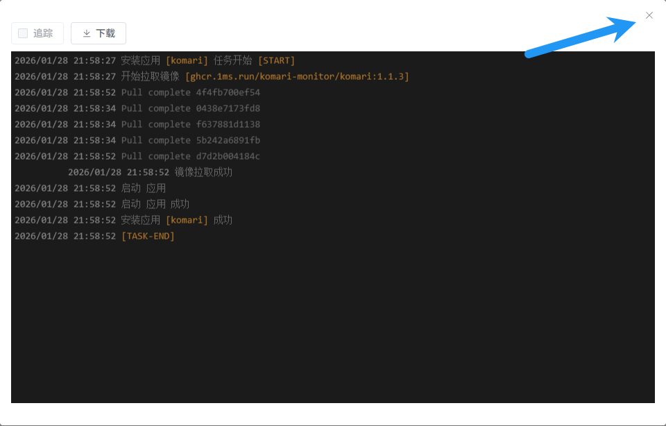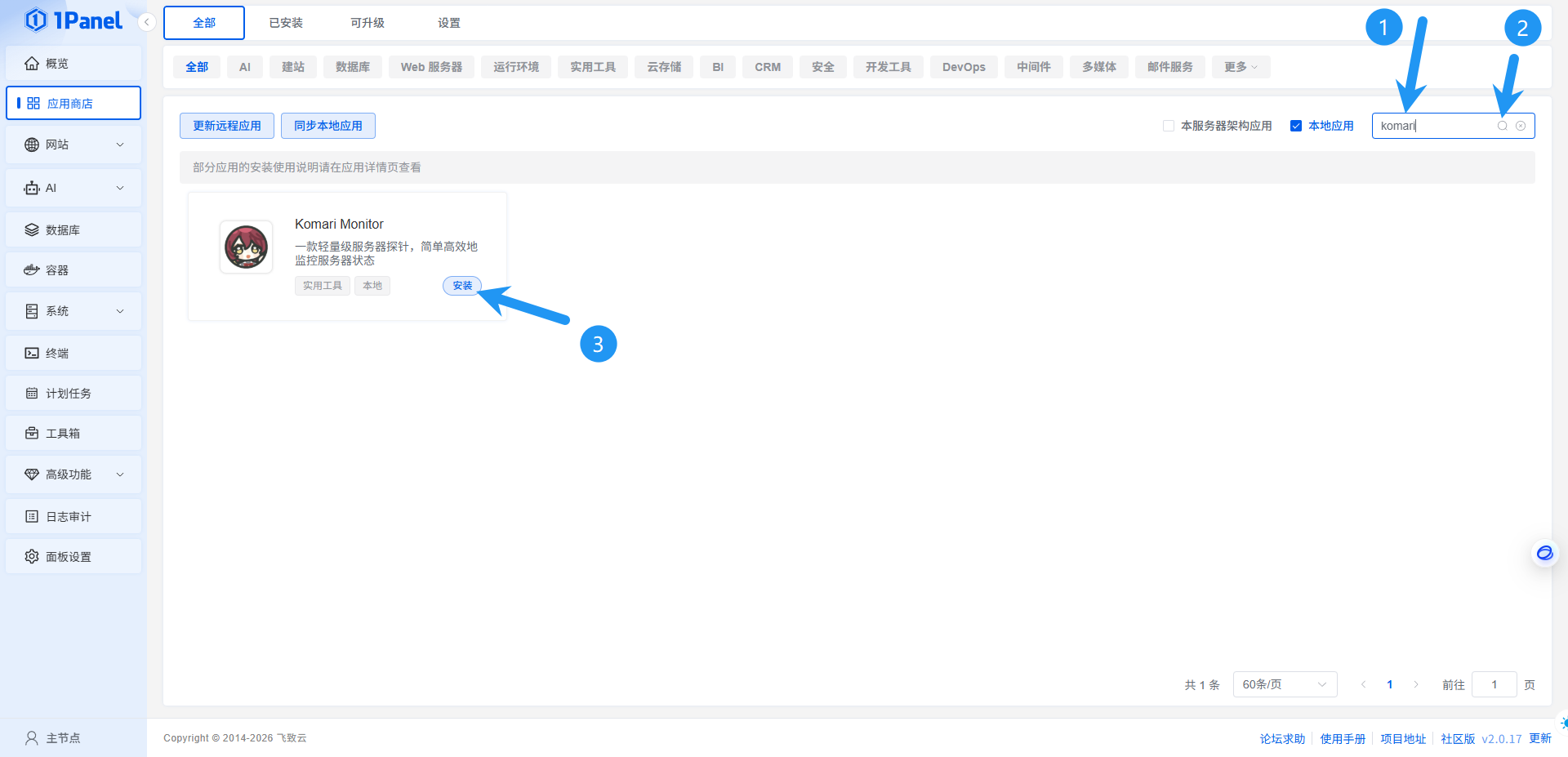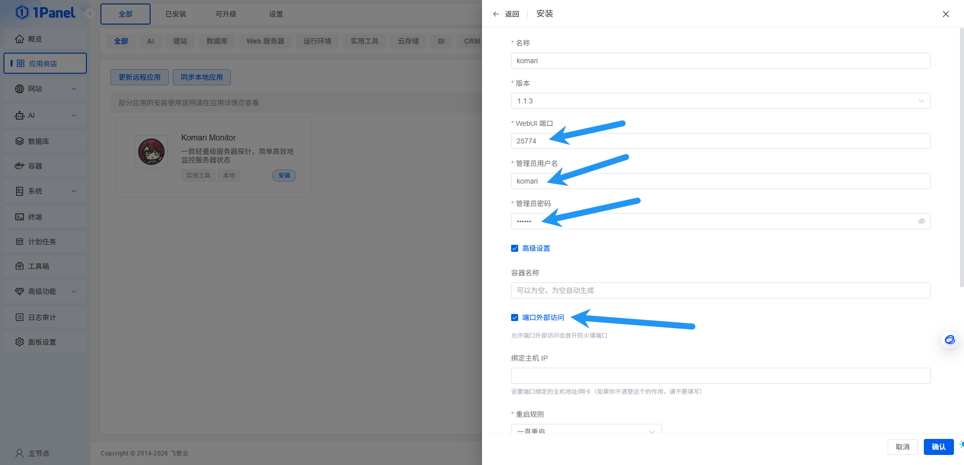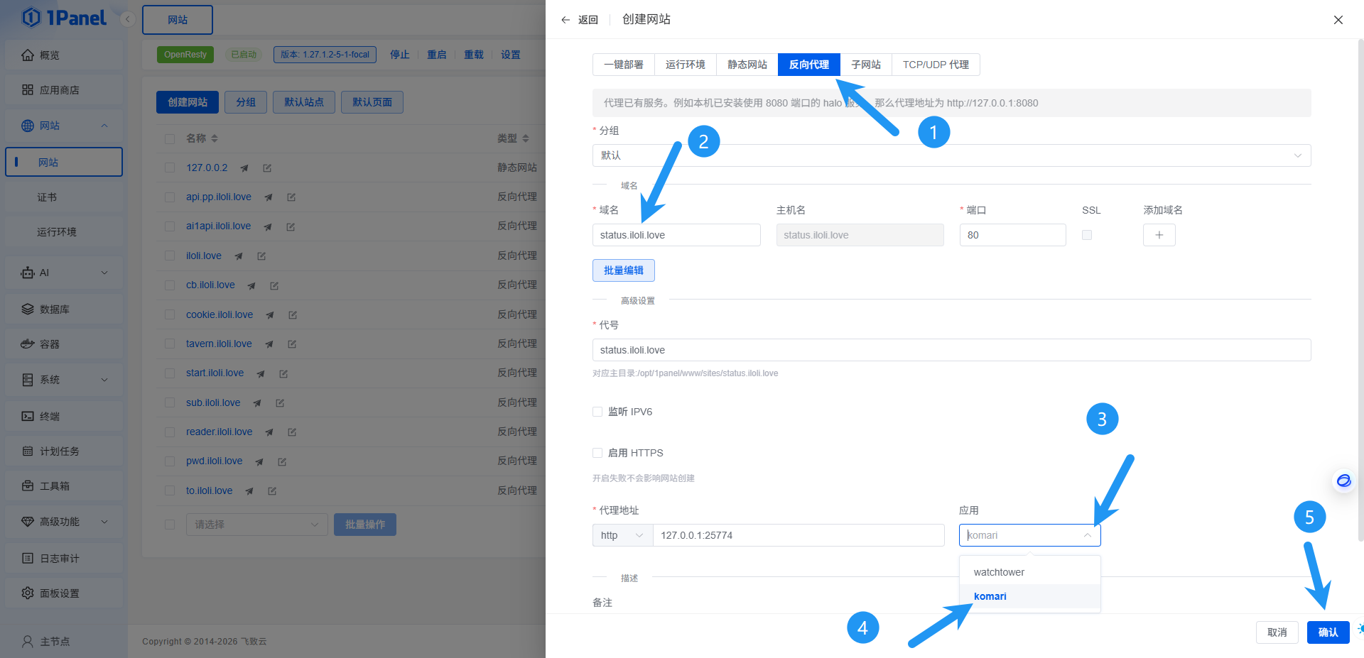 如果你是1panel部署的komari,则点击下拉框,点击komari,点击确认