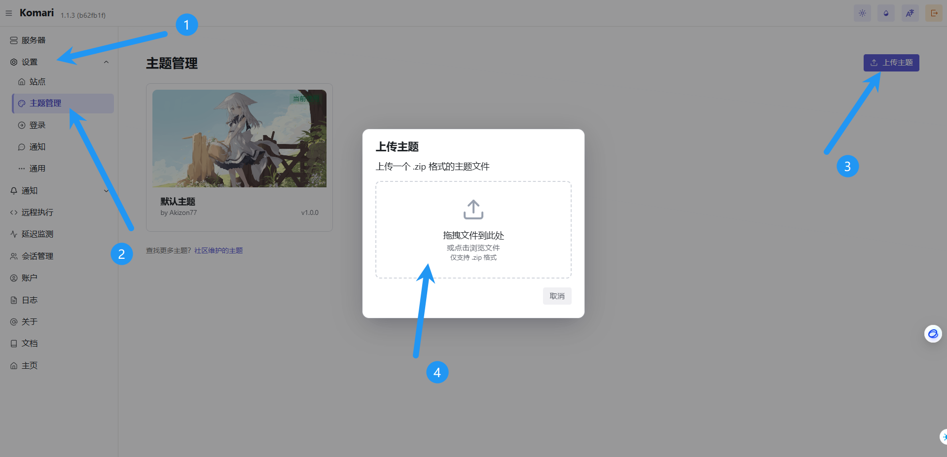 首先,访问releases,下载最新版的主题包到本地 https://github.com/Montia37/komari-theme-purcarte/releases