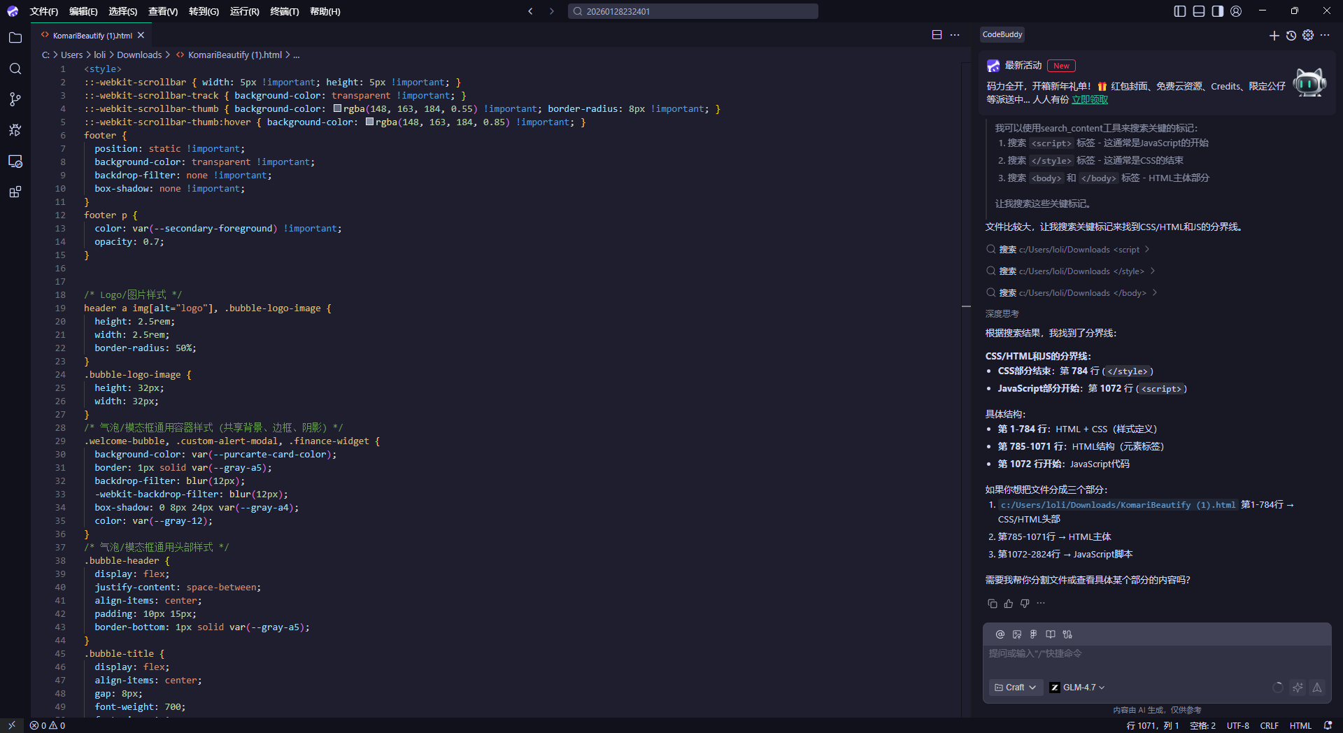 对于KomariBeautify V0.4.2版本,可以翻到第 1071 行,其它版本请自行寻找,上面的全部为CSS/HTML代码,下面的全部为JS代码