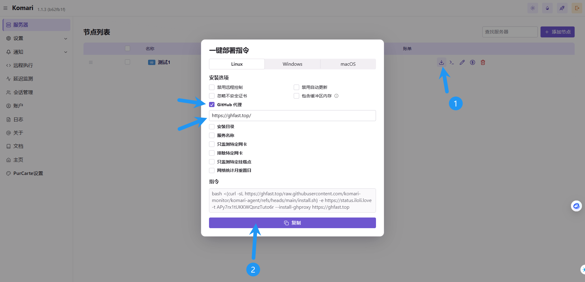 点击一键部署指令按钮,根据服务器的类型和自己所需自行选择安装选项,如果是大陆机器,可以勾选Github代理,然后填写 https://ghfast.top/ (目前可用,可能随时不可用,建议自己寻找),点击复制