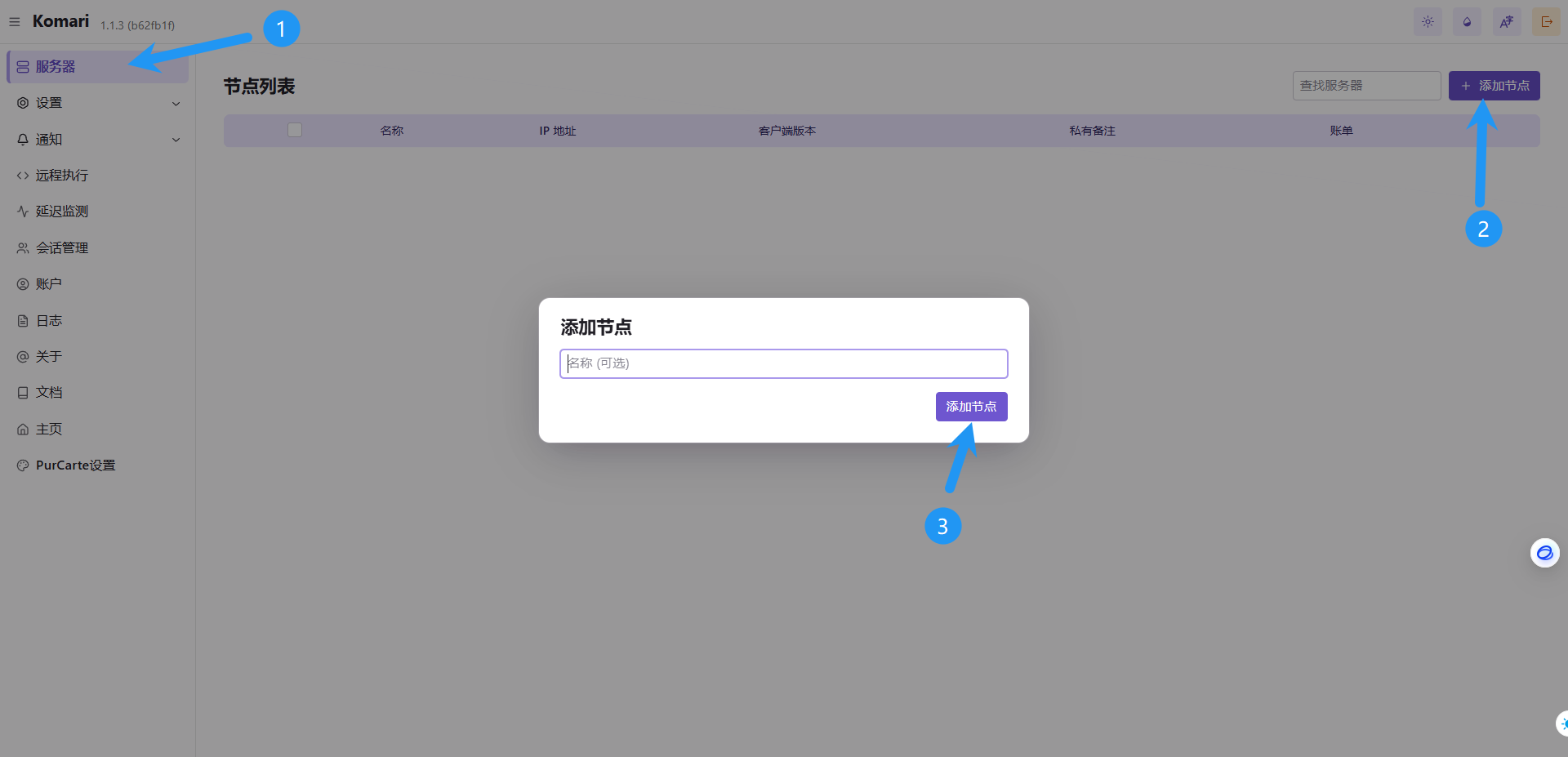 进入后台,点击服务器 - 添加节点,可选填写节点名称,点击添加节点