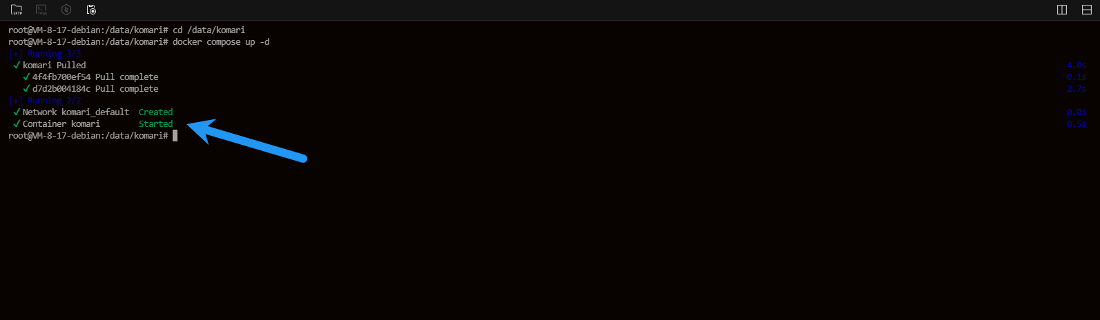 保存后,在 /data/komari 目录下运行命令 docker compose up -d ,如下图,容器启动即成功