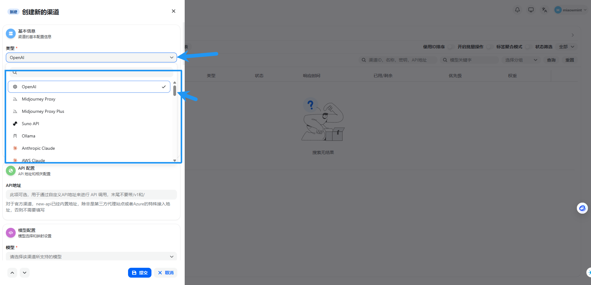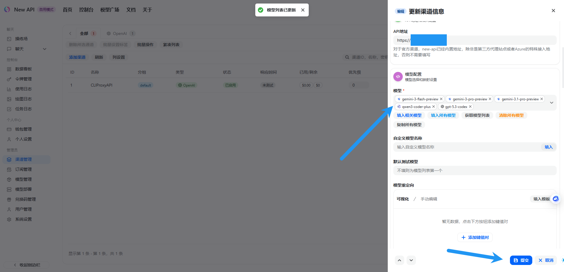 类型默认 OpenAI ,名称随意,填写在CLIProxyAPI配置的密钥,API 地址填写 CLIProxyAPI的服务器IP:端口,或是你反代CLIProxyAPI的域名(一定要注意,地址的最后不要带 / 或者 /v1 ),模型处可以暂时直接点击 填入相关模型 ,点击提交