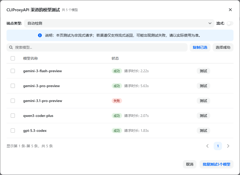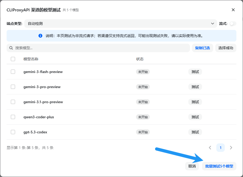可以点击这个小箭头,再点击批量测试,就能看到选择的模型是否能使用了