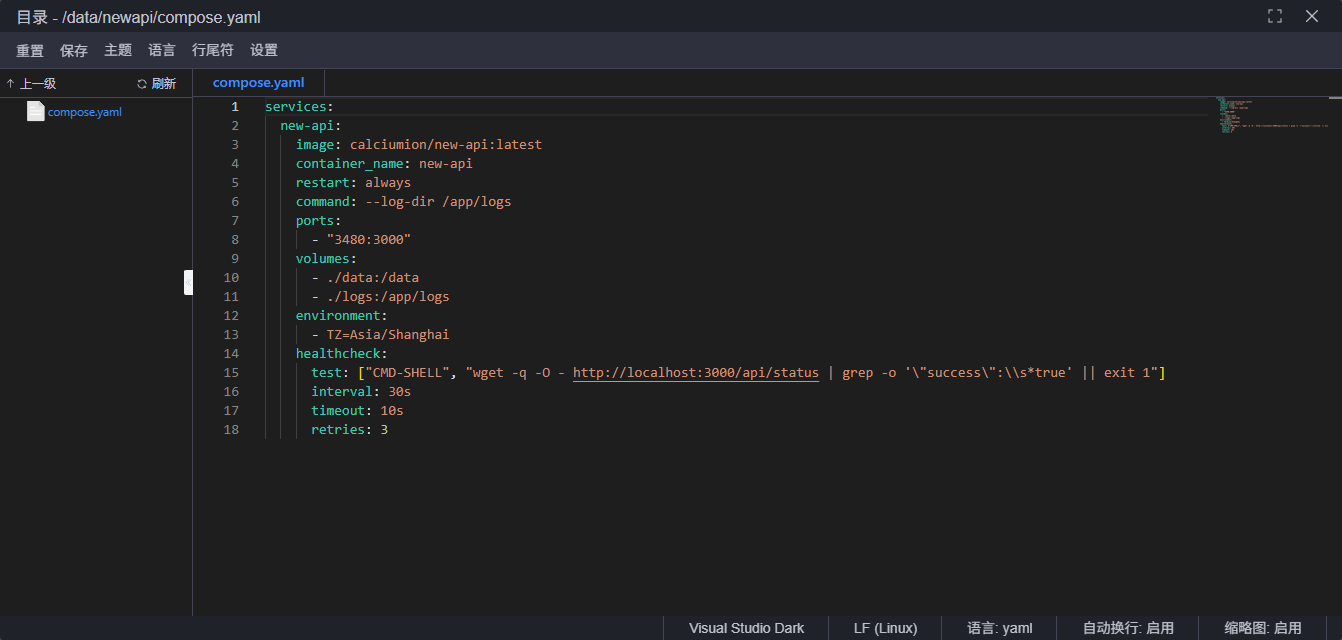 首先选择一个目录,本文中使用的是 /data/newapi ,先在该目录下创建 compose.yaml 文件