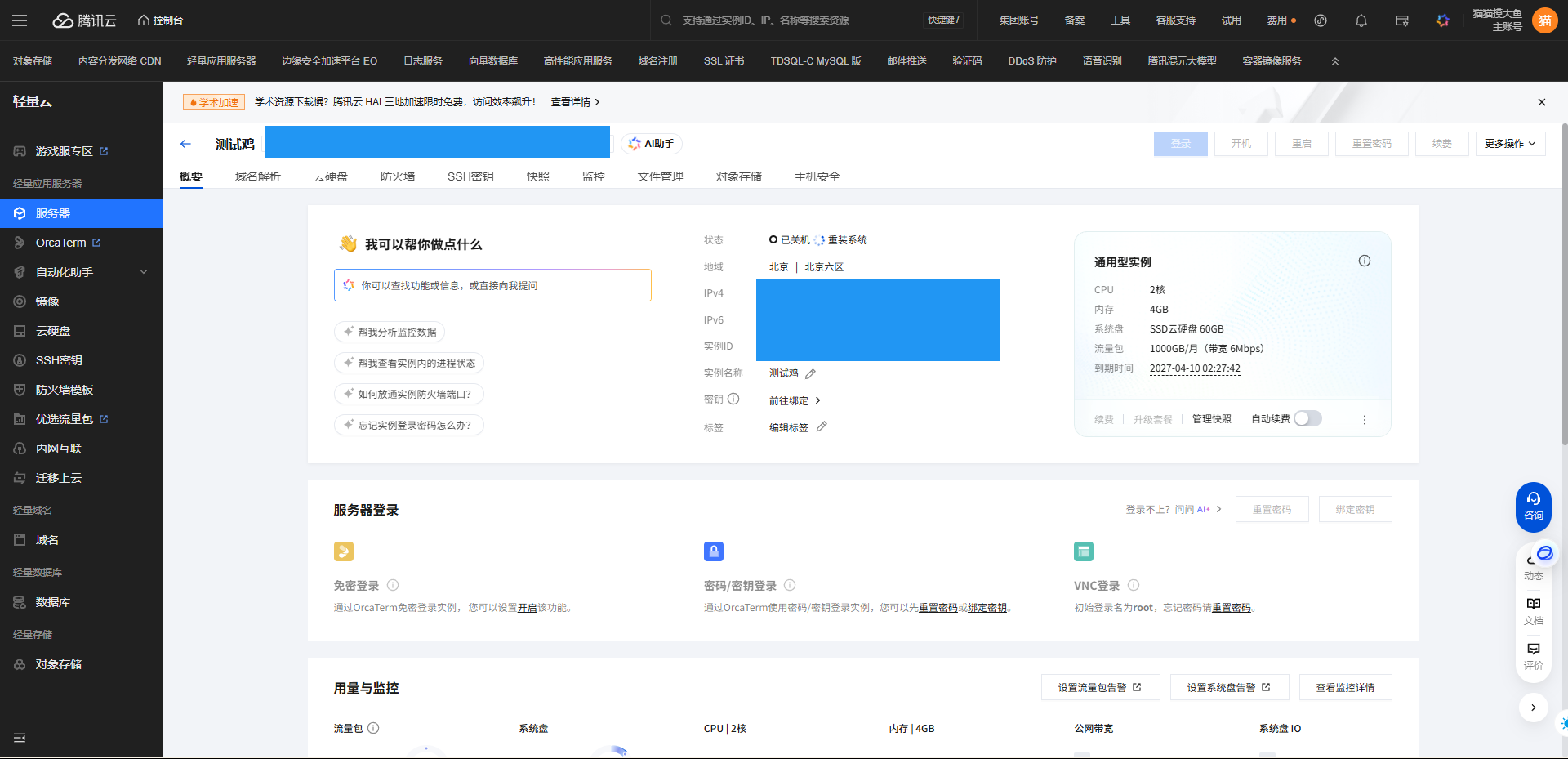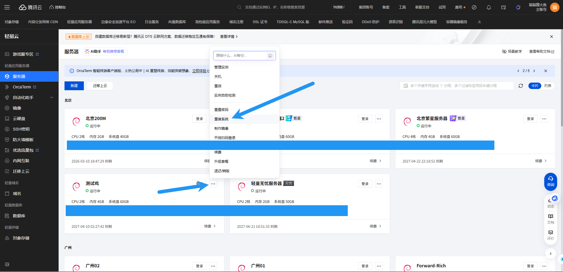 进入腾讯云轻量云控制台,(这里我使用这台名为“测试鸡”的机器进行搭建),点击机器卡片右上角的更多,点击重装系统