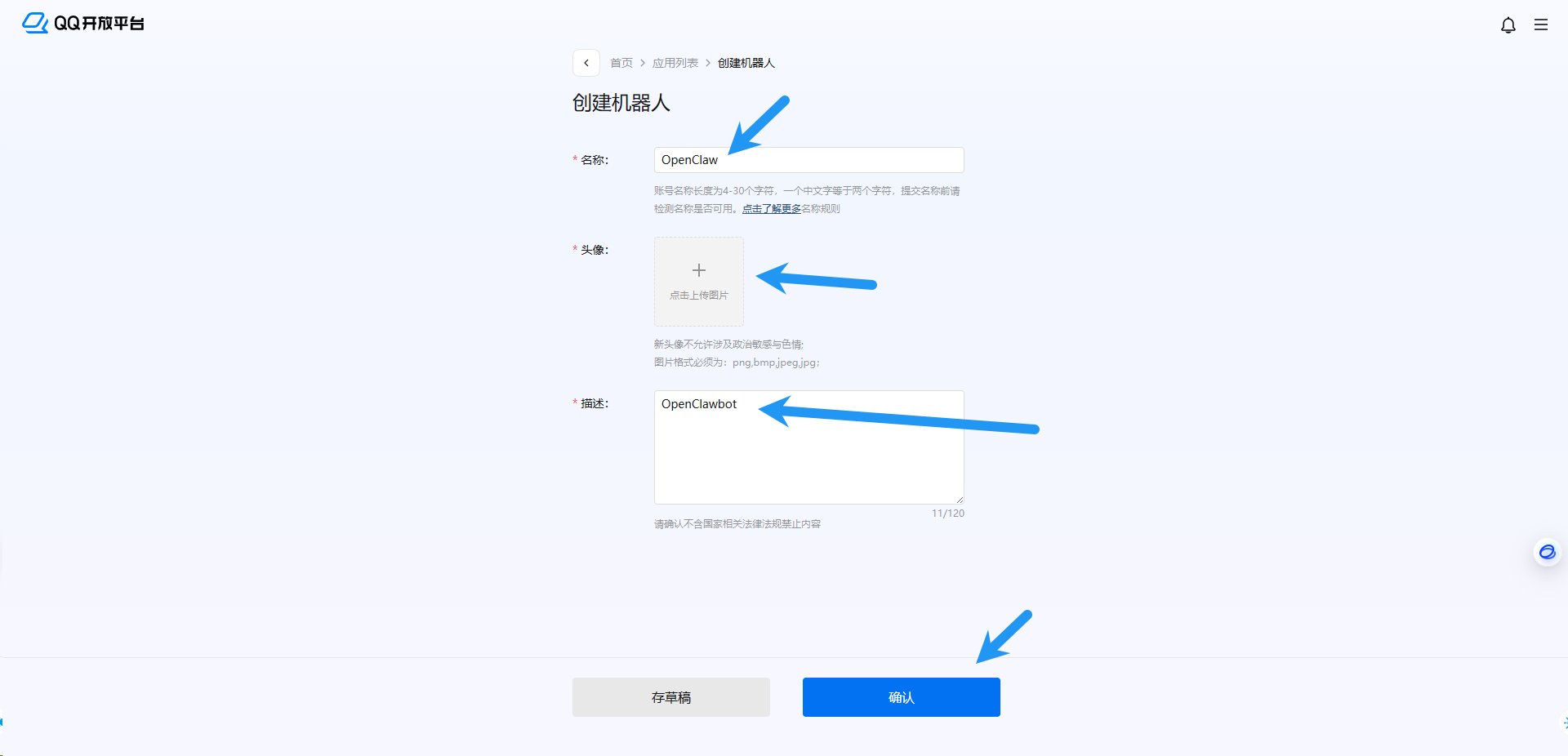 填写机器人名称,上传机器人头像,填写机器人描述,点击确认