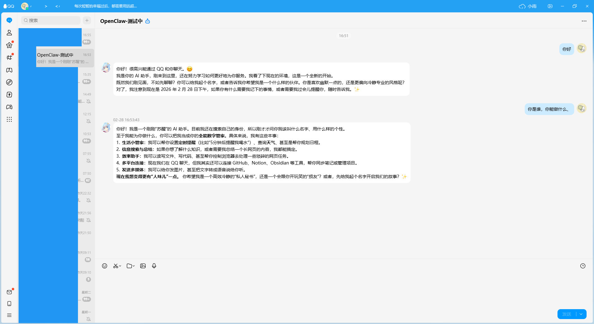 前往QQ,和我们上面扫码添加的机器人进行对话,可以看到已经配置成功了,接下来就可以愉快地开始使用了
