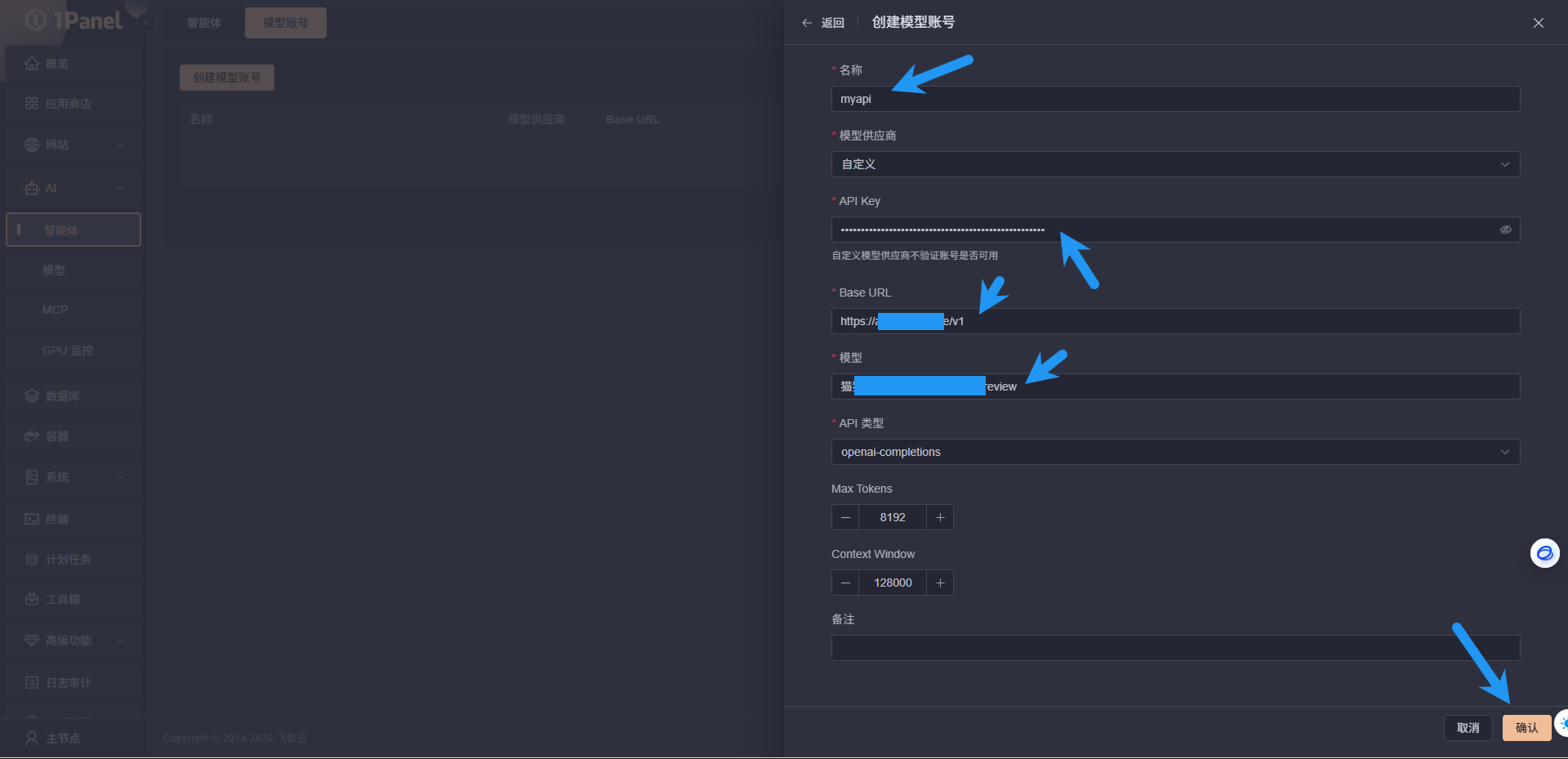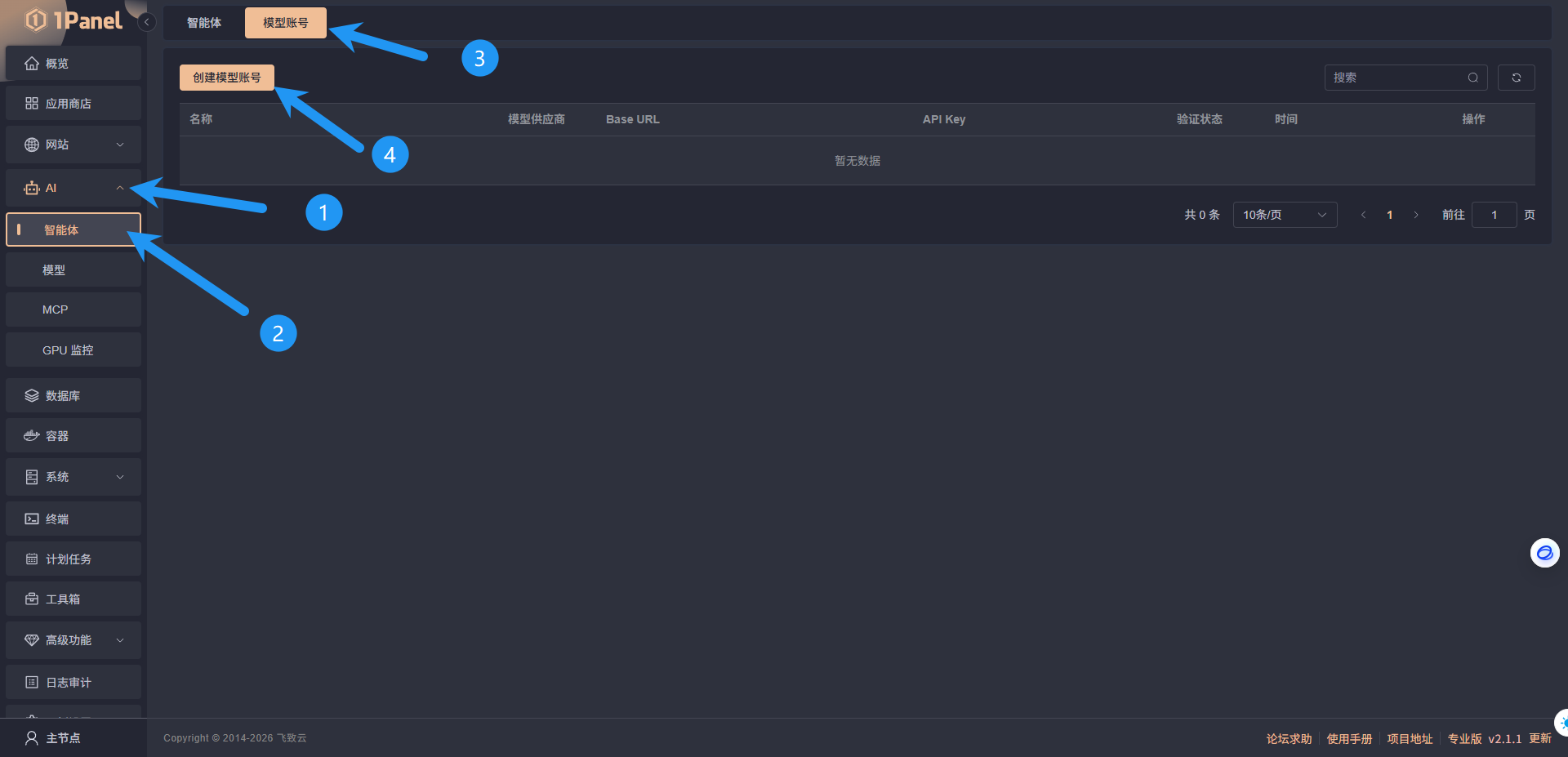 进入 1Panel 面板,点击 AI 下拉,点击智能体,点击模型账号,点击创建模型账号