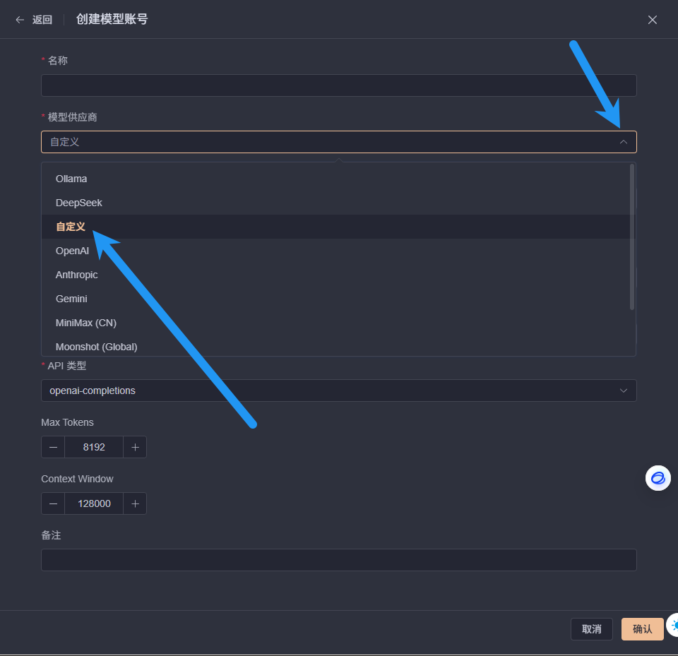 点击下拉模型供应商,选择自定义(这里我要使用的是前面教程反代出来的自建 API,如果你有其他官方 API,也可以直接在这里接入,这里不做赘述)