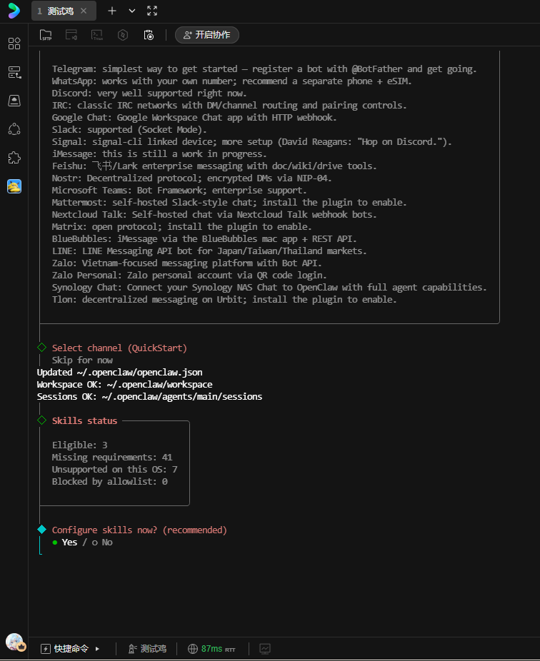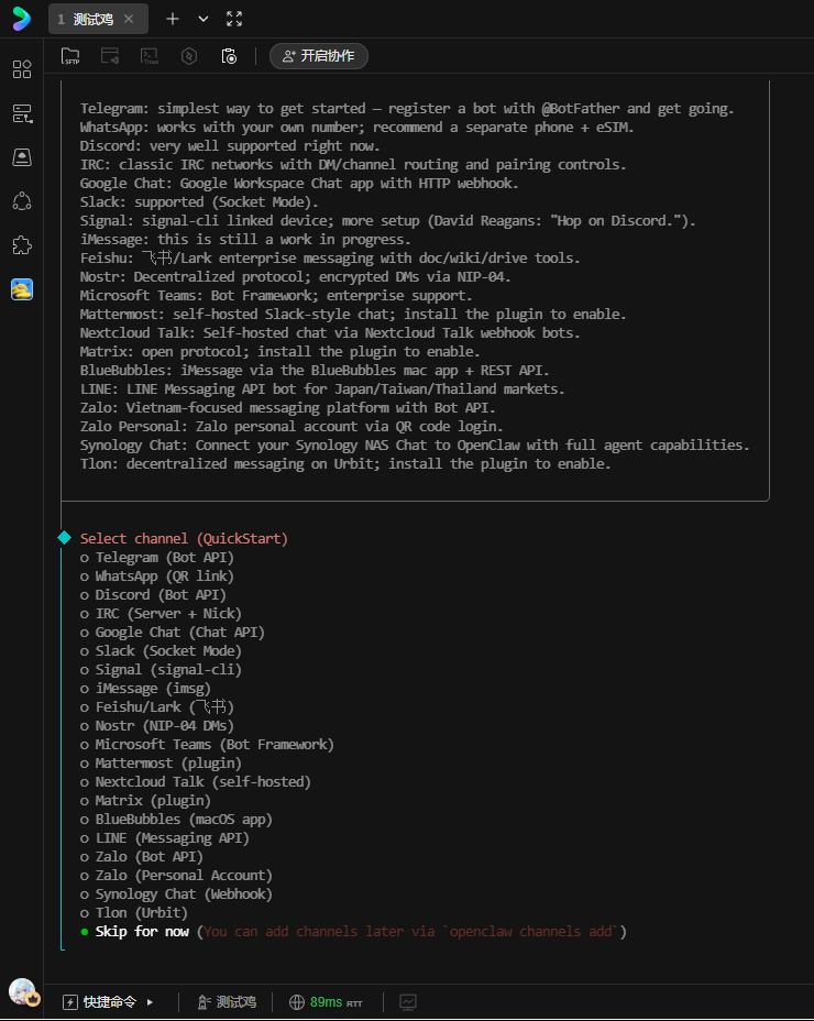 接下来让我们对接通道,可以看到有很多种通道可以用来对接(如果会的话在这里可以自行对接),不过本文中我们选择跳过,回车,直接复用前面文章里写过的QQ对接 (懒)