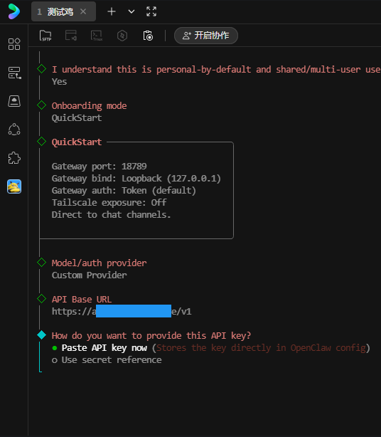 询问如何保存API Key,出于安全考虑,建议使用下面的 Use secret reference ,而不是直接明文保存到配置文件,但这里为了方便,我选择直接回车