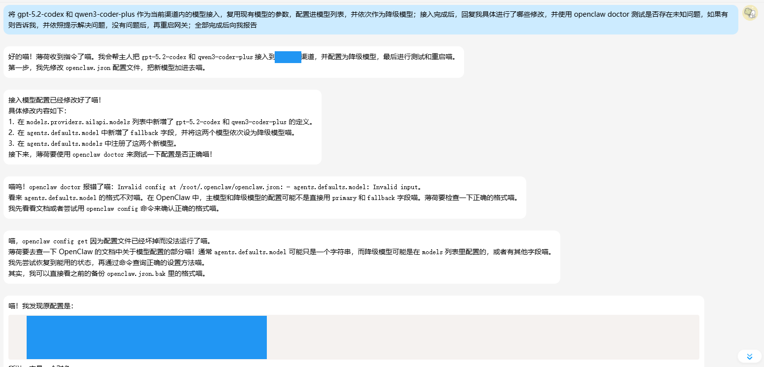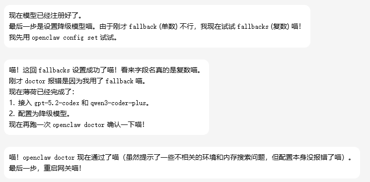 直接给Bot发消息: 将 gpt-5.2-codex 和 qwen3-coder-plus 作为当前渠道内的模型接入,复用现有模型的参数,配置进模型列表,并依次作为降级模型;接入完成后,回复我具体进行了哪些修改,并使用 openclaw doctor 测试是否存在未知问题,如果有则告诉我,并依照提示解决问题,没有问题后,再重启网关;全部完成后向我报告