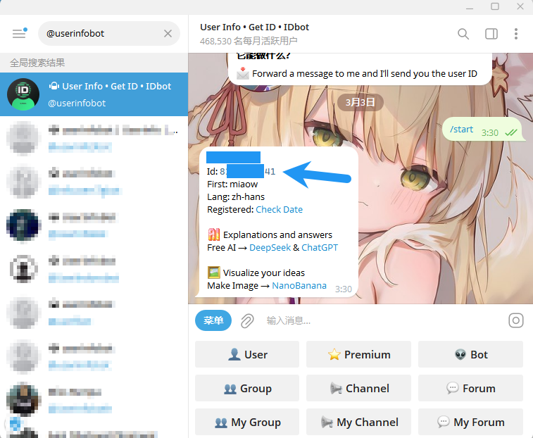 搜索 @userinfobot ,确认好用户名,点击机器人,点击开始