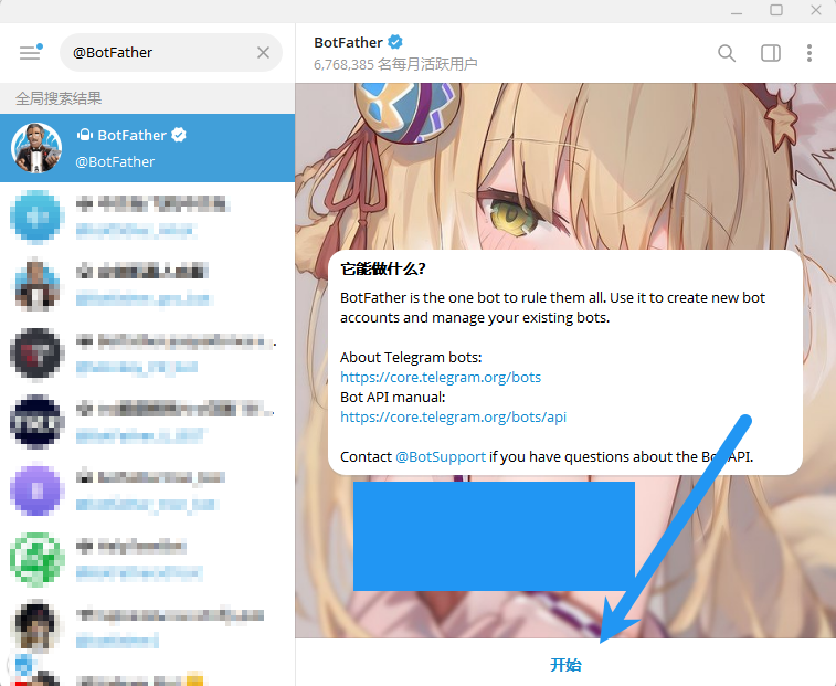 点击这个名为 BotFather 的机器人(一定要看好是用户名为 @BotFather 并且带官方认证的这个)
