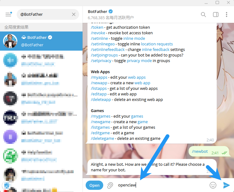 无需理会机器人发了什么,输入 /newbot ,点击发送