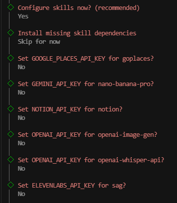 询问我们是否要确认技能,回车,可以看到有很多 skills ,可以挑选自己觉得有用的使用空格键启用(本文也直接跳过),选择完成后 回车 以提交