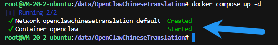 在 /data/OpenClawChineseTranslation 下运行 docker compose up -d ,创建容器,如图即为成功