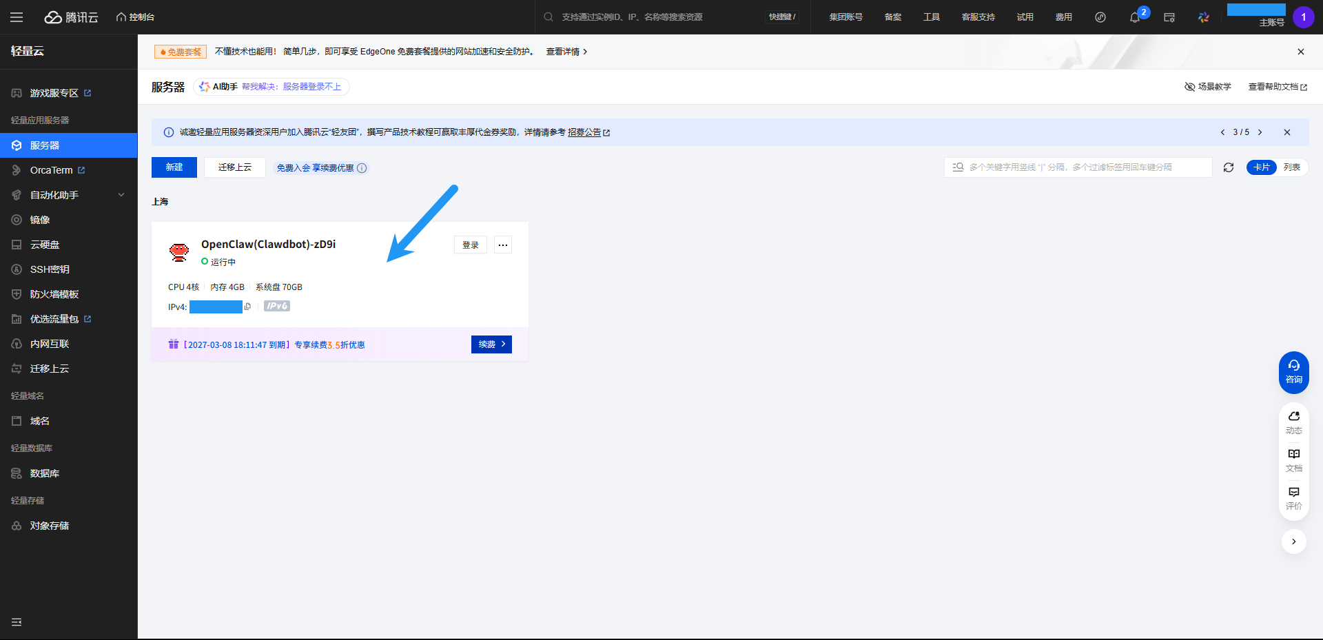 点击访问 https://console.cloud.tencent.com/lighthouse/instance/index,进入腾讯云控制台,并直接点击我们的服务器