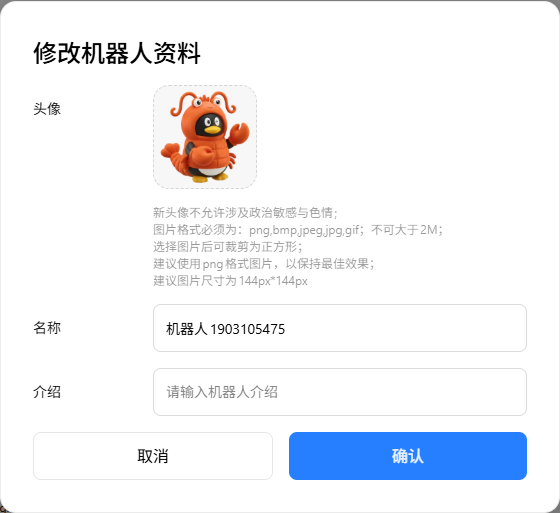 直接就创建好了,可选点击如图的小铅笔图标,编辑机器人的头像、名称和介绍